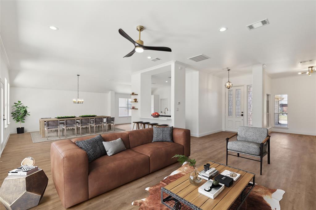 Fully remodeled three-bedroom, two-bath sanctuary nestled on a spacious greenbelt lot in Denton’s exclusive Robson Ranch community. This thoughtfully redesigned residence offers an open floorplan bathed in natural light, ideal for both comfortable living and elegant entertaining. Step into the gourmet kitchen, where shoji white slim shaker-style cabinetry harmoniously pairs with an oversized artesian blue island. Deep-vein valentine gold quartz countertops and Frigidaire Gallery stainless steel appliances make this space a chef's delight. Throughout the home, Delta's Nicoli collection plumbing fixtures in champagne bronze, designer-matched hardware and lighting fixtures accompanied by energy-efficient LED lighting add touches of sophistication. Wide plank quiet step water resistant luxury vinyl flooring extends seamlessly through each room, complemented by tasteful base and crown molding. The living area features a linear fireplace, creating a cozy ambiance perfect for gatherings. Retreat to the primary suite, which boasts bay windows with patio access, an ensuite bath with dual vanities, a seamless glass shower, and a spacious walk-in closet. Additional amenities include a well-appointed laundry room with a sink, a three-car garage providing ample storage, and a large covered patio overlooking the landscaped backyard, greenbelt, and walking trails. Living in Robson Ranch means embracing a vibrant lifestyle with access to tennis courts, a golf course, resort-style pool, and scenic walking trails. Engage with community clubs, enjoy nightlife options, and participate in resident-focused activities. The on-site clubhouse and restaurants offer convenient dining and socializing opportunities. Experience the perfect blend of luxury, comfort, and community in this exceptional home designed with your lifestyle in mind.