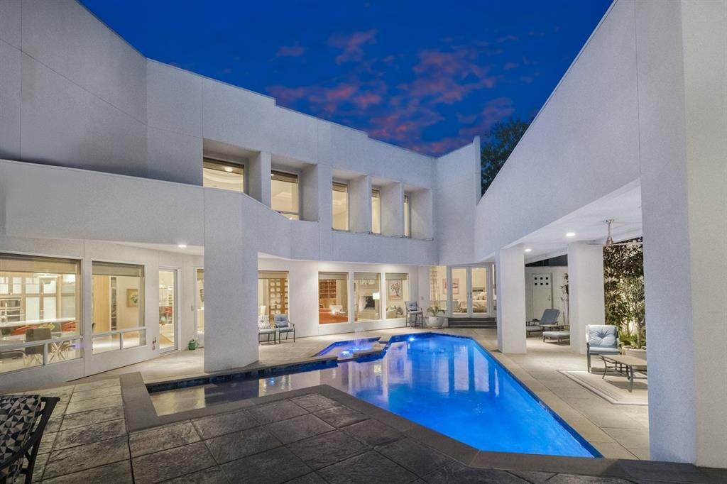 Sleek contemporary modern home designed by Quorum Custom Homes in the quiet, desirable Preston Forest neighborhood. Boasting clean lines and elegant lighting throughout, this architecturally unique home was thoughtfully designed for entertaining. Grand entryway welcomes you into the living room featuring soaring ceilings, maple flooring, and massive bay windows overlooking the pool and courtyard. Kitchen highlighted by a gorgeous waterfall quartz island. East wing features private office, gym, and master suite with vaulted ceilings and oversized closets. Take the elevator to the 2nd floor with lounge space and wet bar overlooking the living room; private theatre room, 3 bedrooms, game room, and 25' balcony. Maple flooring throughout first floor. Custom wet bar and wine closet off of dining area. Mother-in-law or Guest suite privately located in West Wing. Kitchen with Quartz waterfall island and backsplash; Miele, Bosch, and Wolf appliances, warming drawer, built-in coffee maker, and dishwasher.
