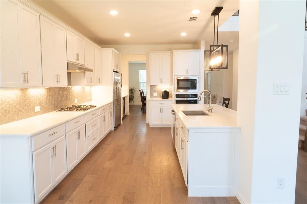 Motivated Sellers. New Lower Price. No MUD or PID! Spacious, Light-Filled Single Family Home Near Celina's New Methodist Hospital. This move-in ready home blends warmth and functionality with soaring ceilings, honey-toned wood floors, and abundant natural light. Chef’s kitchen includes quartz countertops, gas cooktop, stainless oven and microwave, walk-in pantry, and sunny dining nook. Dedicated office, formal dining, and grand living area with cathedral ceiling and floor-to-ceiling windows. Two downstairs bedrooms with ensuite baths—perfect for guests or multi-generational living. Luxe primary suite features bay windows, dual vanity, soaking tub, glass shower & custom walk-in closet. Upstairs: 3 bedrooms, game room, and media room with built-in speakers. Covered patio opens to spacious backyard—ideal for pool, garden, or play. Located in a quiet, friendly neighborhood just 3 minutes from trails, ponds, playground & pool.