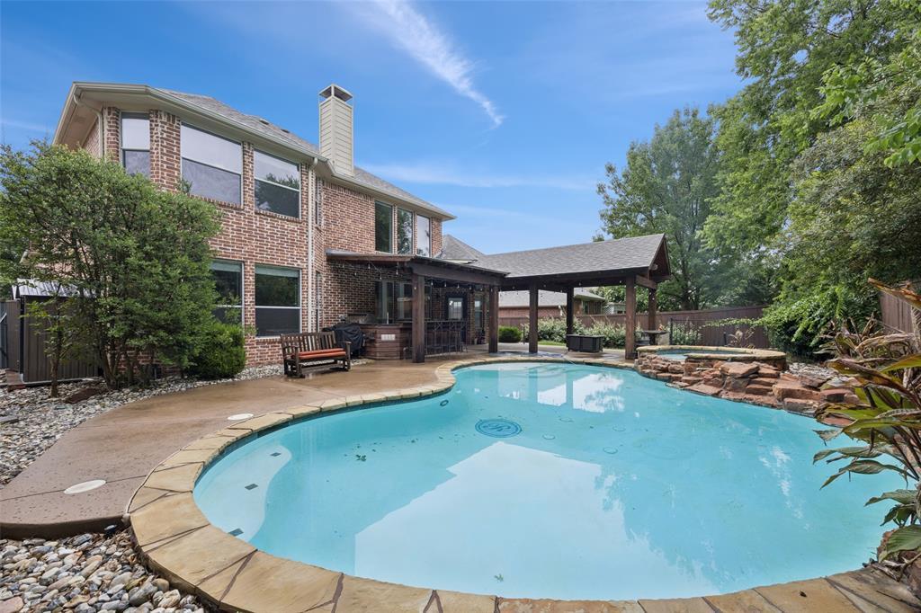This stunning east-facing home offers five spacious bedrooms and three full bathrooms with a fresh, modern style. The luxurious primary suite is located on the main floor, complete with a private ensuite bath and a custom-designed walk-in closet. A second bedroom downstairs provides easy access to a full bath and can also serve as a private office space. The kitchen is a true centerpiece, featuring sleek countertops, premium appliances, and tasteful decorator paint tones that create an inviting and functional space. The open-concept layout includes a spacious living area and formal dining room, enhanced by rich wood flooring. Elegant lighting adds a refined touch to the entryway, dining room, and breakfast nook. Throughout the home, you’ll find plush carpeting and durable tile flooring in all the wet areas. Upstairs, you’ll find three generously sized bedrooms, a full bathroom, and a very large media room—perfect for movie nights, game days, or entertaining guests. Step outside into a backyard designed for entertaining, complete with a sparkling pool and attached spa. The outdoor kitchen features a built-in KitchenAid grill, flat top, and cooler. A cozy pergola offers a shaded retreat for relaxing or enjoying poolside meals, making this home an ideal space for gathering with family and friends.