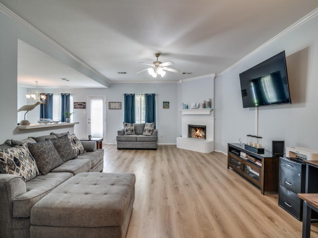 PRICED TO SELL! Welcome to this beautifully updated home in the desirable Rustic Meadows! Featuring 3 bedrooms, 2 full baths, and an open-concept layout, this residence is packed with charm and functionality. Step inside to find stylish vinyl plank flooring throughout, soft neutral wall colors, and crisp white crown molding framing the inviting living room – complete with a cozy corner fireplace. The dining area flows seamlessly into the open Kitchen which boasts a large island and fresh white cabinetry. The Master Suite is tucked at the back of the home and offers a spa-like ensuite bath with dual sinks, garden tub, separate shower and large walk-in closet. You’ll love the oversized utility room with built-in shelving—ideal for extra pantry space or storage needs. Outside, relax on your large covered patio overlooking a generous backyard ready for a pool, trampoline, or garden. Major updates completed in 2017 include the roof, AC unit, and water heater, providing peace of mind. Conveniently located near shopping, dining, and easy access to I-30 and Hwy 66. NO HOA and eligible for USDA financing. Price non-negotiable. Schedule your tour today!