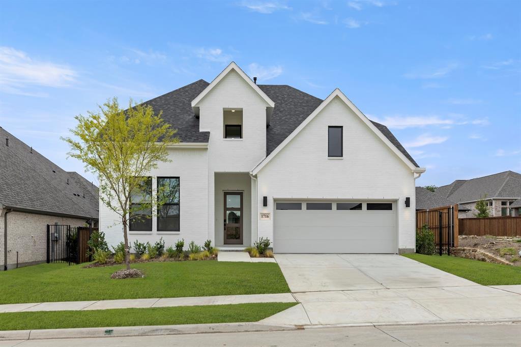 MLS# 20941034 - Built by Drees Custom Homes - Ready Now! ~ This stunning new architectural design showcases a sophisticated transitional exterior, featuring painted brick, sleek black window frames, dark roof shingles, and a striking modern glass front door. Inside, this thoughtfully designed two-story home offers a spacious three-car garage, two secondary first-floor bedrooms, and soaring vaulted ceilings in the luxurious primary suite. The primary retreat boasts a spa-inspired bath with a freestanding soaking tub and an expansive walk-in shower, creating the perfect sanctuary for relaxation.