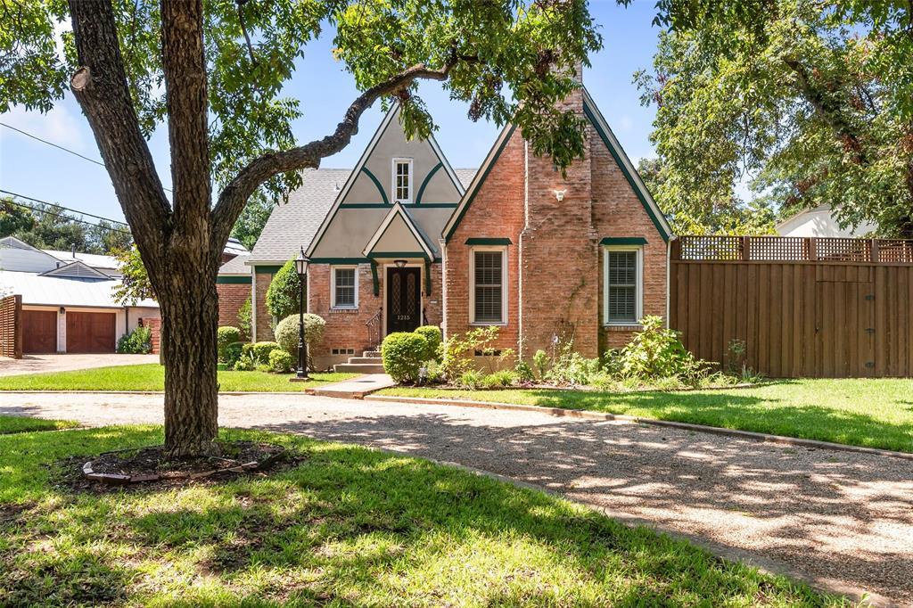 Timeless Tudor-style home with storybook appeal and striking architectural character inspired by medieval English design. The steep gable roof, weeping mortar, decorative half timbering, and tall chimney with ornate brickwork and chimney caps create a dramatic and unforgettable exterior. Leaded glass on the front door and tall, narrow windows invite natural light and enhance the home's charming asymmetry. Inside, cozy spaces with low ceilings and two gas log fireplaces with dentil molding offer warmth and character. Hardwood floors grace the formal areas and main level primary bedroom, adding richness and continuity. The large, updated kitchen is a true centerpiece, featuring a prominent island, granite countertops, marble backsplash, built-in refrigerator and freezer, beverage fridge, central vacuum system, custom cabinetry, and glass-front upper doors. A four-season porch with French doors and its own HVAC system provides a serene space to enjoy year-round. The den includes custom bookshelves, a fireplace, and floor-to-ceiling windows that frame views of the lush surroundings. Upstairs, angled ceilings follow the home’s rooflines, and the updated bath offers a clawfoot tub, vaulted beamed ceiling, separate shower, and dual period-style vanities. The primary bath includes heated floors for added comfort. Outside, a tall iron lamp highlights the home’s natural textures and brick-lined path leading to the front door. An electric gate provides access to the garage with workshop and backyard, where a meandering stone path leads to a private yard. The pie-shaped lot features towering trees, an expansive front lawn, circular driveway, and a more natural, slightly untamed landscape that complements the home’s enchanting aesthetic. Whole house 20 kw generator! Located near Stevens Park Golf Course with easy access to shopping, dining, both airports, and downtown Dallas. This home is a rare blend of historic charm and thoughtful updates in a truly magical setting.