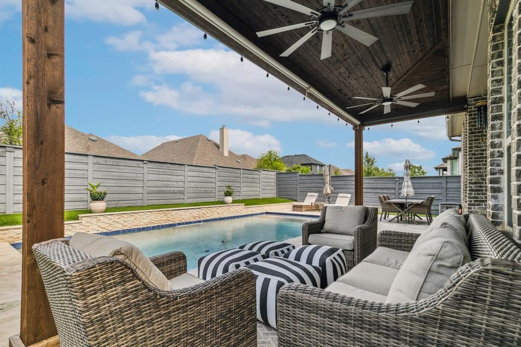 Enjoy the outdoors in your private backyard retreat featuring a sparkling swimming pool, turf for low-maintenance living, a covered patio, and retractable shades. The home is also equipped with plantation shutters on every window and a tankless water heater for energy efficiency and endless hot water.