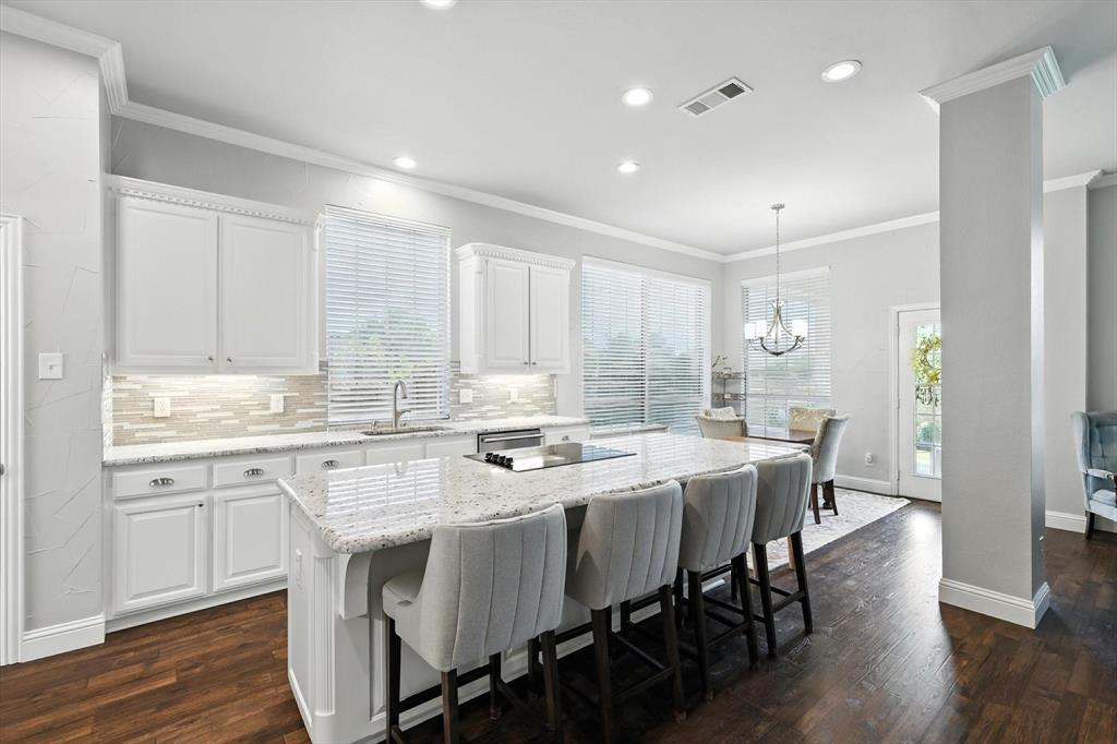 Welcome to this BEAUTIFULLY updated and well-maintained 4-bedroom, 3.5-bathroom home in the highly sought-after Lantana community! This spacious layout offers both a MEDIA ROOM or WORKOUT SPACE and GAMEROOM, perfect for entertaining and everyday living. Walking through the updated front door, you'll find engineered hardwood floors that flow throughout the downstairs as well as the detailed crown molding. The dining room features custom wall paneling and decorative lighting, along with a dedicated pass through to the kitchen making dinner parties a breeze! The granite countertops and crisp white 42inch cabinetry with custom trim work creates an inviting atmosphere with seating for four at the generous sized island! The private primary retreat overlooks the backyard through bay windows with room to sit and enjoy your morning coffee. The tray ceiling with crown molding create a luxurious feel as you unwind from your day. This spa like primary bathroom is complete with decorative floor tiles, a freestanding tub with chandelier, river rock floor tile in the shower, and a spacious primary closet. Upstairs you'll find three additional bedrooms and two full bathrooms, along with a game room and media room with surround sound speakers, and dimmable lighting for your movie nights! The quality carpet throughout the upstairs has been lightly used, and well cared for. The solar screens, roof, and gutters were all replaced in June of 2024, and the water heater in the upstairs closet and garbage disposal were replaced in 2025! This home is move in ready! MUST SEE! Living in Lantana means access to five pools, a splash pad, scenic nature trails, multiple playgrounds, a fishing pond, pickleball, basketball, and tennis courts, two workout facilities, and community events throughout the year. Come experience this vibrant Golf Course Community!