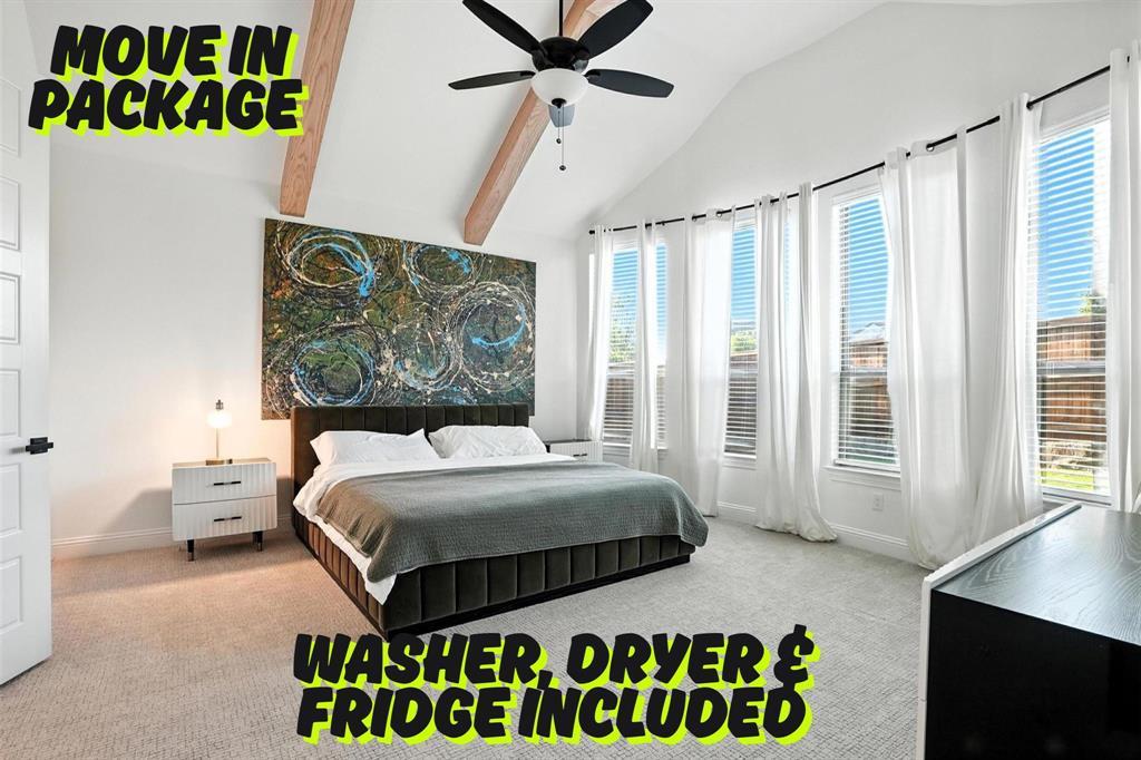 BETTER THAN A NEW BUILD!!! UPGRADES DONE!! and now offering a MOVE IN PACKAGE.. SAMSUNG WASHER, DRYER AND FRIDGE. This beautifully upgraded 4-bedroom, 4-bath home offers flexible space, designer finishes, and a premium lot with no rear neighbors — backing to a peaceful pocket park for added privacy. Step inside to find warm hardwood floors, soaring ceilings, and abundant natural light pouring through oversized windows. The open-concept living space centers around a sleek fireplace with surround detail, framed by wood-beamed ceilings and stylish accent walls. An upgraded glass panel front door and matte black hardware throughout the home create a consistent, elevated aesthetic. The kitchen features quartz countertops, stainless steel appliances, designer tile backsplash, ample cabinetry, and a spacious walk-in pantry — all open to the dining and living areas for seamless entertaining. Glass French doors enclose the private office, while a dedicated media room provides the perfect space for movie nights or game-day hosting. The primary suite offers a luxurious retreat with plush upgraded carpet and extra-thick padding underfoot, along with a spa-inspired bath featuring a frameless glass shower, drop-in garden tub, dual vanities, and a large walk-in closet. A secondary bedroom with private ensuite is ideal for guests or multigenerational living. Every bedroom benefits from upgraded carpet and premium padding throughout the home. A large mudroom and a 3-car garage round out the functional features. Located in a no-rental community, Sandbrock Ranch residents enjoy access to a fitness center, two dog parks, multiple playgrounds, walking trails, an on-site elementary school, two catch-and-release fishing ponds, and a one-of-a-kind tree house. Just minutes from Frisco, 3 miles to Costco, 4 miles to H-E-B, and 6 miles from the upcoming Universal Theme Park — this home offers the perfect blend of elevated comfort and prime location.