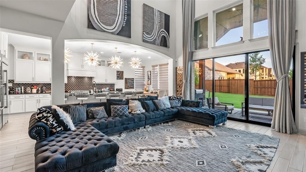 The family room features a high ceiling, floor to ceiling marble fireplace with floating shelves on both sides of the fireplace and glass sliders that lead out to the oversized 90ft backyard.