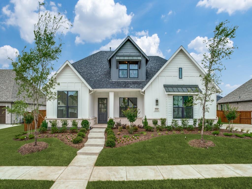 RISLAND HOMES BELVEDERE floor plan. READY NOW! Highly sought-after layout in the heart of Prosper! Picturesque bright-white farmhouse elevation on oversized lot. Complimentary brick & black painted accents on beautifully landscaped East facing interior lot! Generously sized porch offers enough space for 2 so early mornings can be enjoyed alongside a loved one, coffee & that one-of-a-kind Texas sunrise! Front door opens to a wide foyer hall leading to inviting living space. Exercise your culinary expertise in this kitchen complete with KitchenAid appliances, pot filler, waterfall island, & white cabinetry! Adjacent to the kitchen of your dreams is the family room where memories are waiting to be made! Floor-to-ceiling tiled fireplace accentuates sky-high ceilings & open to below feature! Family room boasts wall of windows plus massive telescoping sliding glass door! Retreat to the primary suite - a space fit for comfort & rejuvenation! Enjoy the free-standing tub, floor to ceiling tiled shower finished with rainfall showerhead, and TWO large walk-in closets! One primary closet is connected to the larger-than-life utility room! Handle business in style in this study finished with glass doors and large window! Head upstairs to enjoy the spacious game room with iron railing overlooking the family room. Huge media prewired for those movie nights and sleepovers! Four bedrooms grace this gorgeous home with two down and two up – one ensuite bedroom located upstairs! The two-car garage has a spacious extra storage nook to organize or use as an open area for workout equipment! Home has engineered hardwood flooring in all common spaces and carpet in all bedrooms for maximum comfort! New Prosper ISD Elementary school is located within the community with plans for opening Fall 2025! Enjoy amenities with clubhouse, infinity pool, work out room, yoga lawn, playground, pond and walking trails. See this home anytime from dawn to dusk through the NterNow system!
