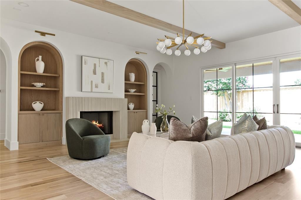 The exterior makes a dramatic first impression with warm brick, natural stone, and expansive windows, while the arched entry sets the tone for the elegance found within. Inside, light-filled open spaces feature soaring ceilings, wide-plank flooring, and a seamless flow ideal for both everyday comfort and hosting at scale.