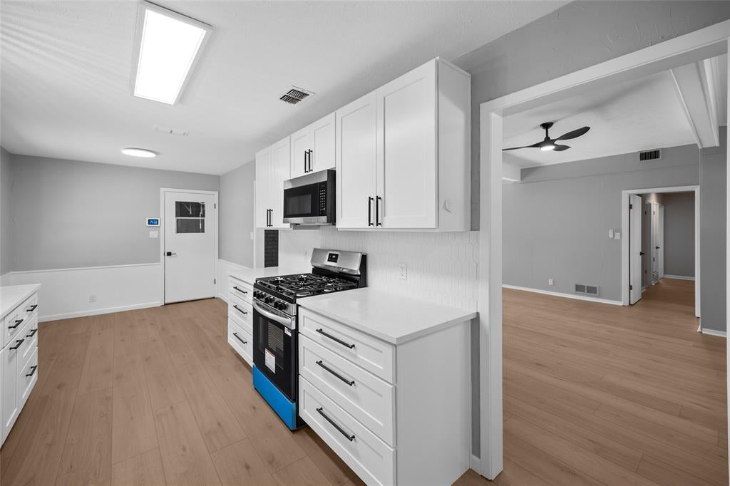 Step inside to find fresh interior paint, light wood toned luxury vinyl plank flooring throughout the main living areas, and designer lighting. The kitchen shines with quartz countertops, shaker-style cabinets, stainless steel appliances including gas range, microwave, refrigerator, and a subway tile backsplash. The living room’s cozy wood-burning fireplace flows seamlessly to the dining and breakfast areas, creating a warm, open environment perfect for everyday living and entertaining.