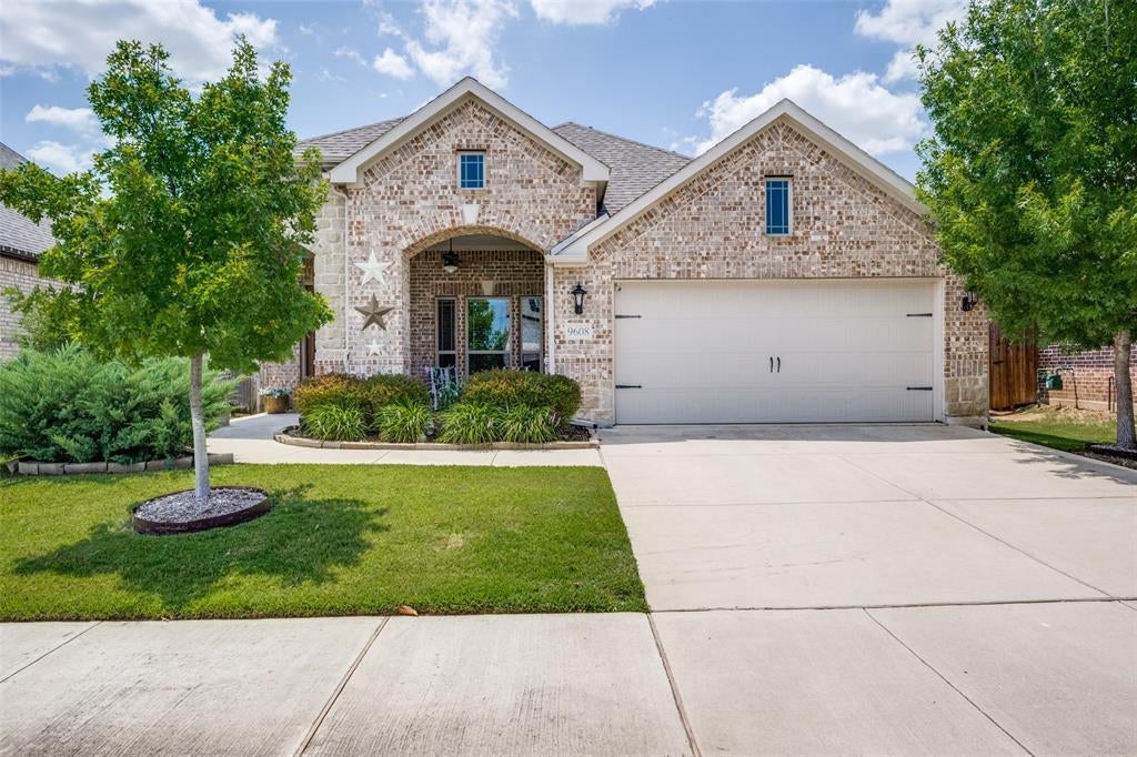 Bloomfield's popular one story Dogwood floorplan! 3 spacious bedrooms plus a study! Sit on the large front porch & visit with your neighbors. As you enter you'll see the study located off the foyer with French doors & views to the front porch. The kitchen features a large quartz island & quartz countertops, farm sink, an abundance of cabinets & counter space & stainless steel appliances. You'll love the open flow between the kitchen, dining room & living room. There is a floor to ceiling stone fireplace & niche for your entertainment center in the living room. The primary bedroom is split from the other bedrooms. Wood look ceramic tile & 5 inch baseboards throughout. Decorative ledges with lots of windows that bring in natural light. Retreat to the backyard and relax on the covered patio after a long day. Fantastic neighborhood with community pools, lakes, trails, playgrounds & a dog park. Easy access to 35W and 377. Recently zoned to Guyer High School!
