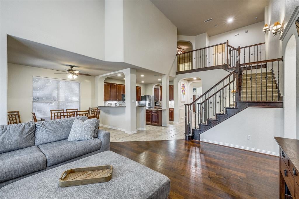 Seller is offering $2500 concession for a rate buy down!!!! This spacious 4-bedroom, 2.5-bathroom home welcomes you with a grand foyer, setting the tone for its bright and open interior. The main living area features soaring ceilings and large windows that flood the space with natural light, perfect for entertaining or relaxing. The kitchen is a chef’s dream with a butler’s pantry or coffee bar, walk-in pantry, granite countertops, ample cabinet space, and a convenient island for easy meal prep. Downstairs, you’ll find the primary suite with separate vanities, an oversized dual shower, soaking tub, and his-and-hers walk-in closets, as well as a private office for working from home. Upstairs, three additional bedrooms surround a media room and living area, providing plenty of space for family or guests. Step outside to a backyard with a covered patio, turf lawn, and plenty of space for gatherings. Residents enjoy community amenities including a pool, splash pad, and playground. With quick access to Chisholm Trail Parkway, shopping, dining, and more, this home combines style, function, and location perfectly. Owner is the listing agent
