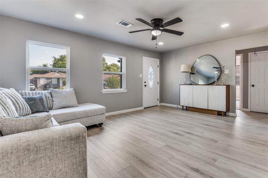 Welcome to this beautifully renovated 4-bedroom, 2-bath home in the heart of Grand Prairie! With fresh modern finishes inside and out, this move-in ready property blends comfort, style, and functionality. Step inside to an open-concept living, dining, and kitchen area featuring wood-look flooring, recessed lighting, and plenty of natural light. The kitchen boasts white shaker cabinets, quartz countertops, stainless steel appliances, and a sleek black faucet, creating a clean and timeless design. The spacious primary suite offers privacy and a fully updated en-suite bath with a walk-in shower, while three additional bedrooms provide flexibility for family, guests, or a home office. Both bathrooms showcase modern tile work and updated fixtures. Outside, you’ll enjoy a large backyard — perfect for entertaining, gardening, or simply relaxing under the shade of mature trees. With its fresh curb appeal, updated systems, and prime location near major highways, shopping, and schools, this home is ready for its new owners. Ask about the lender-paid 1-0 interest rate buydown available through our preferred lender. Subject to lender approval.