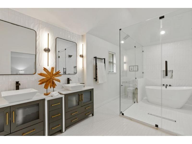 The primary suite is a true masterpiece designed by a local interior designer to evoke a spa-like experience. Step into a space that feels luxurious and serene, featuring elegant tilework, a soaking tub, double vanities, and a custom walk-in closet that blends beauty with functionality.